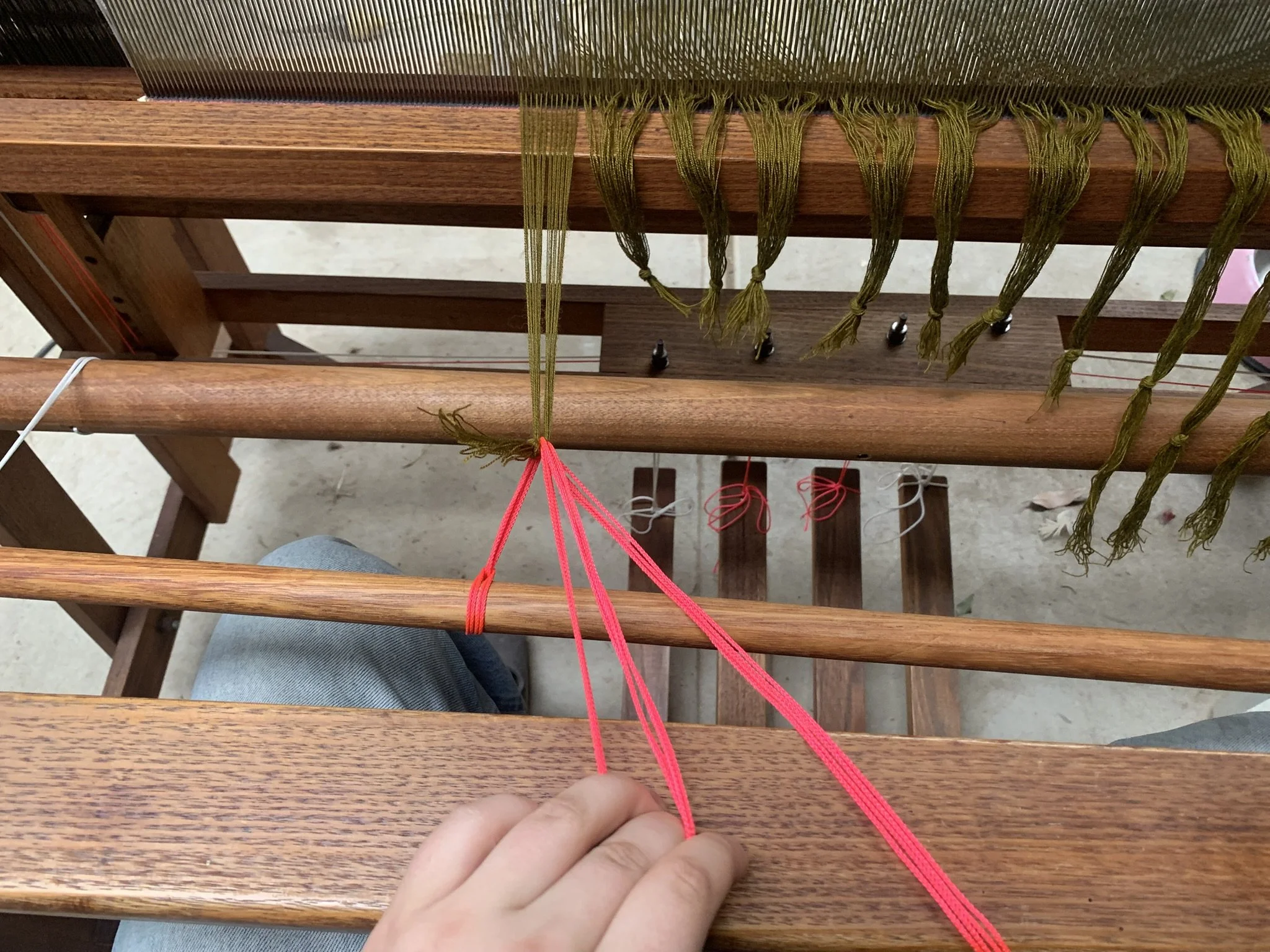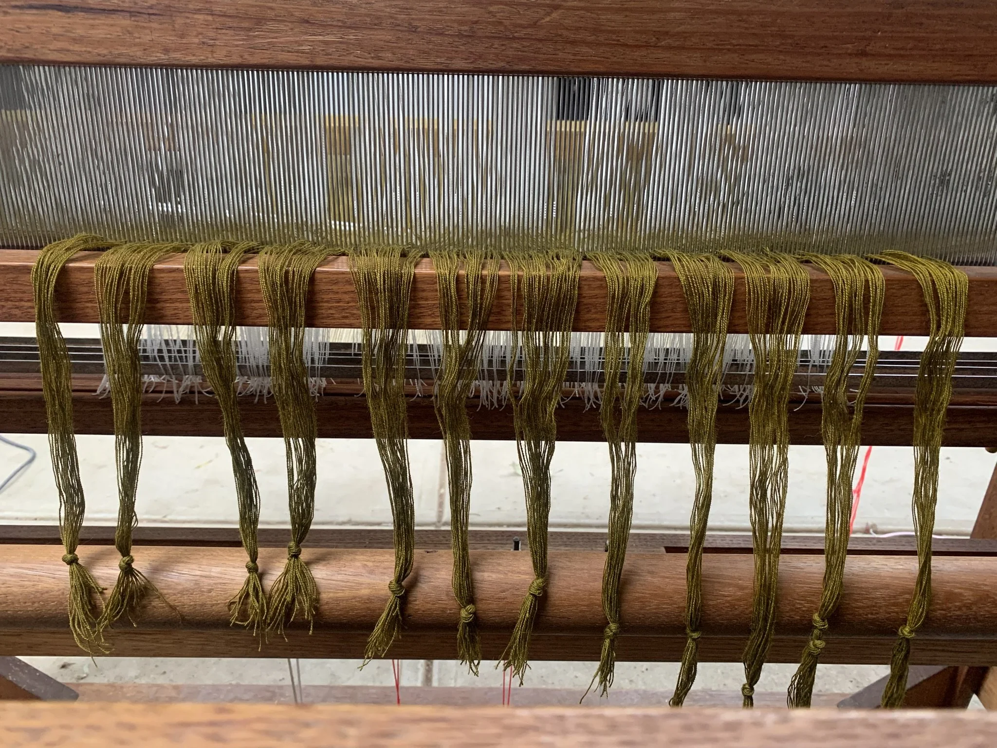 8. Now threaded, the warp is tied into knots.