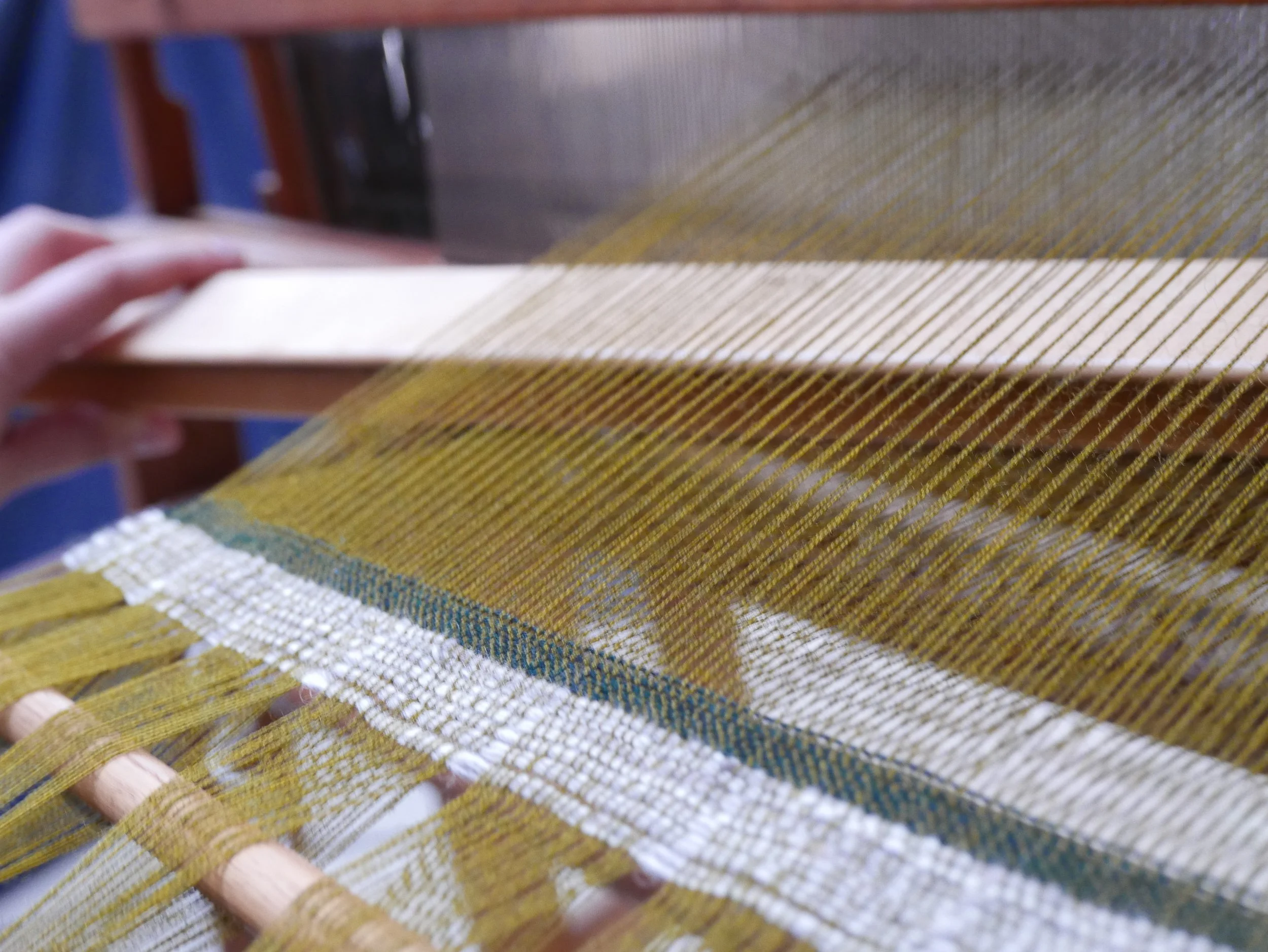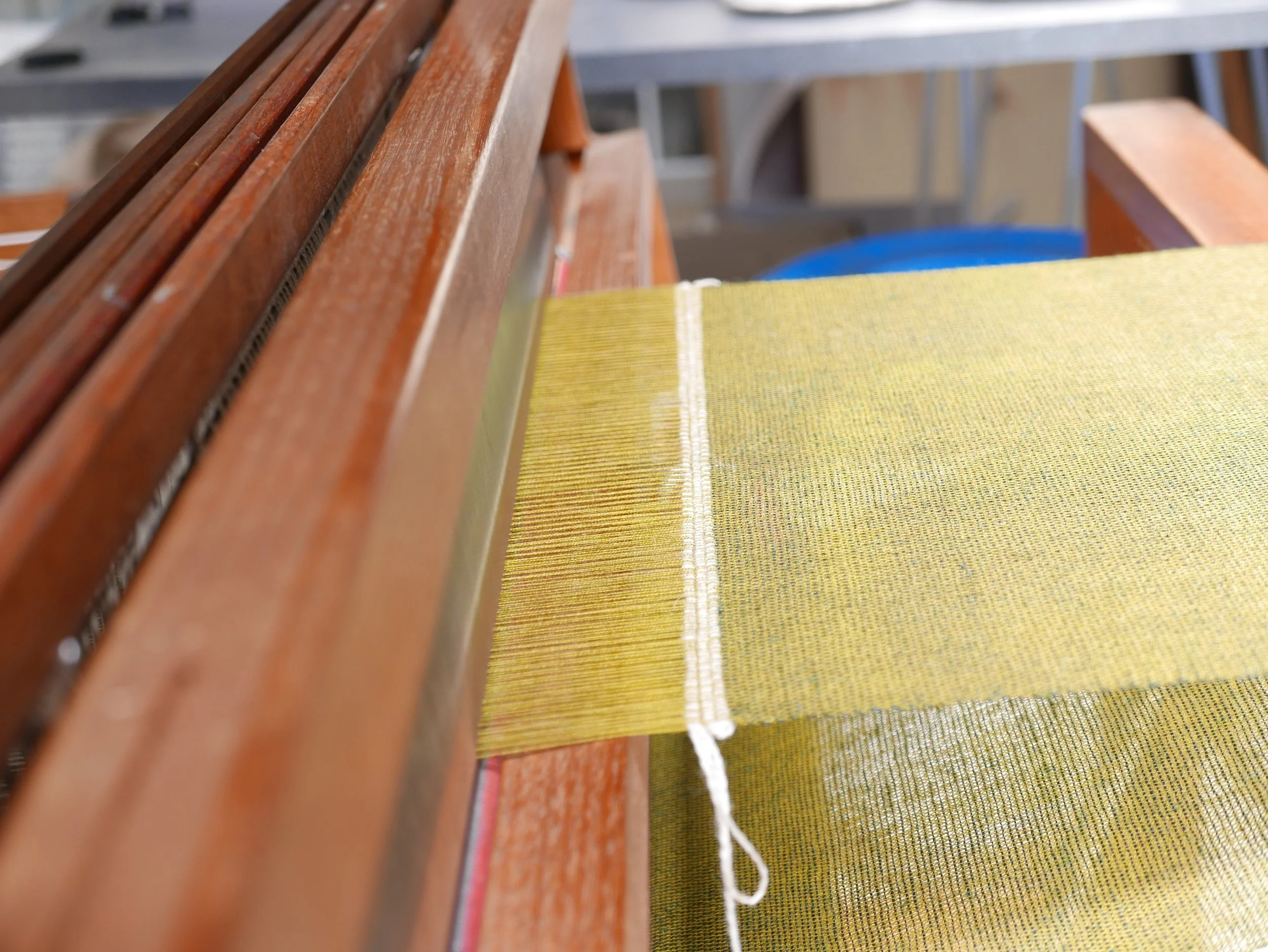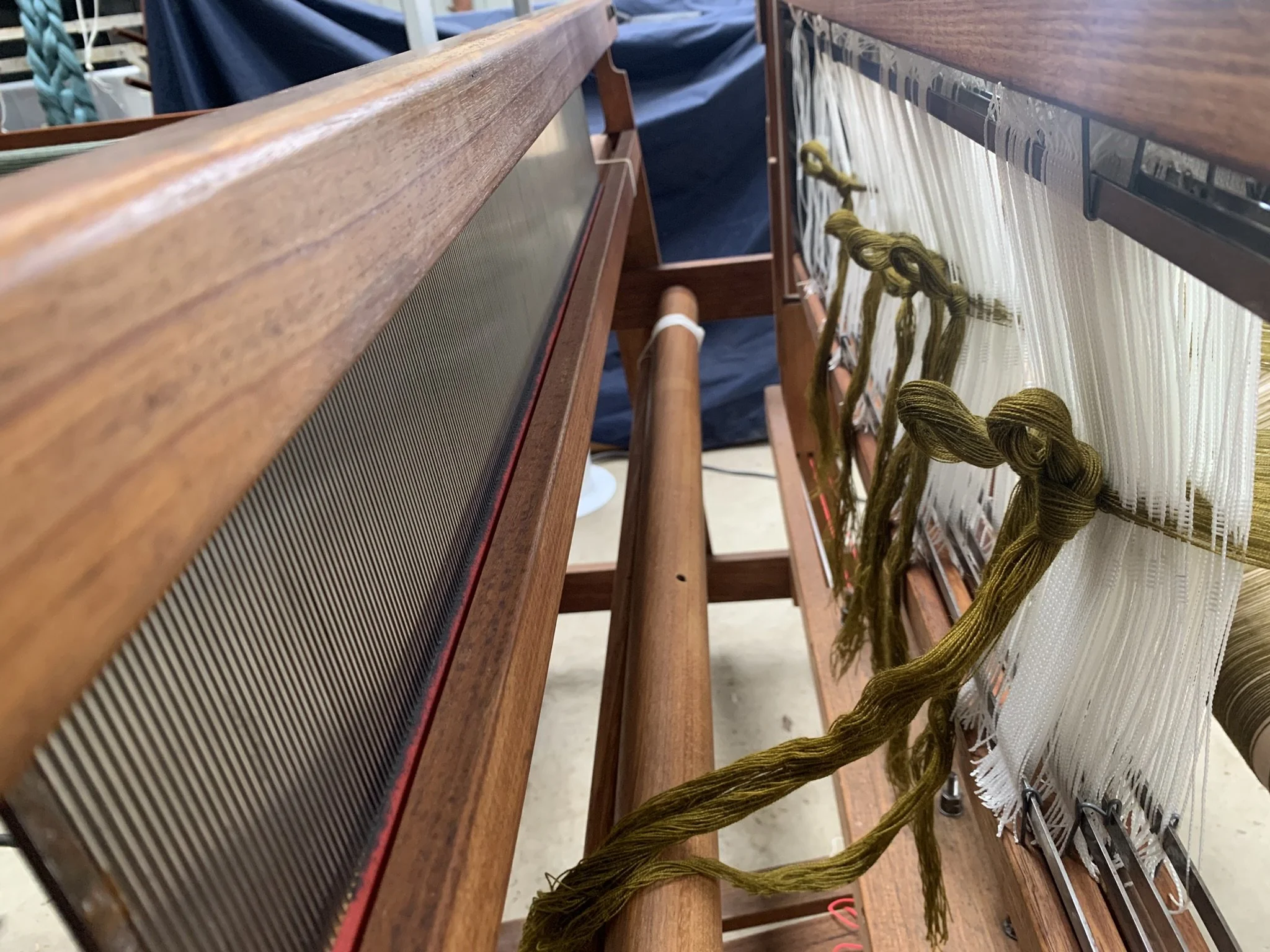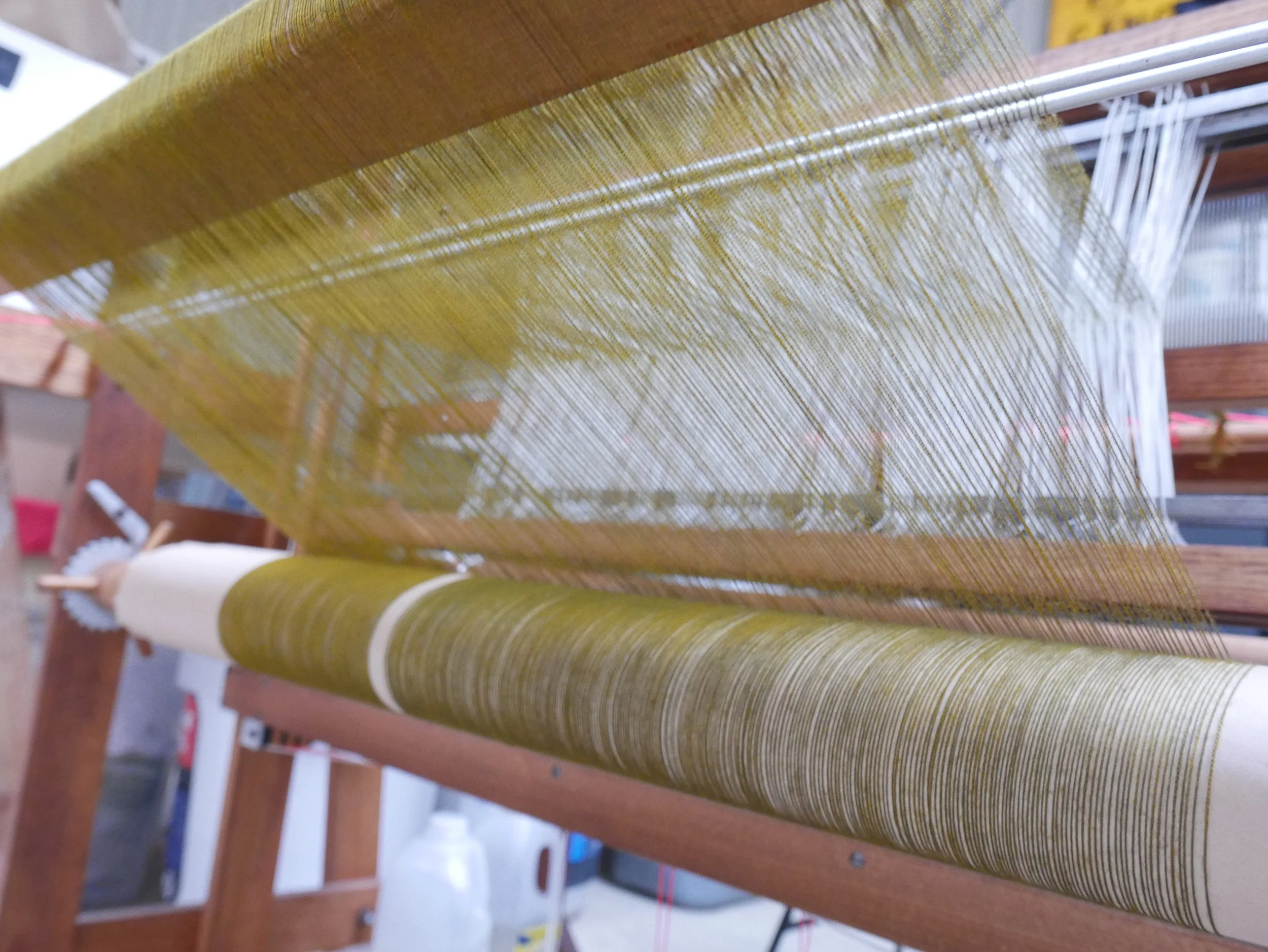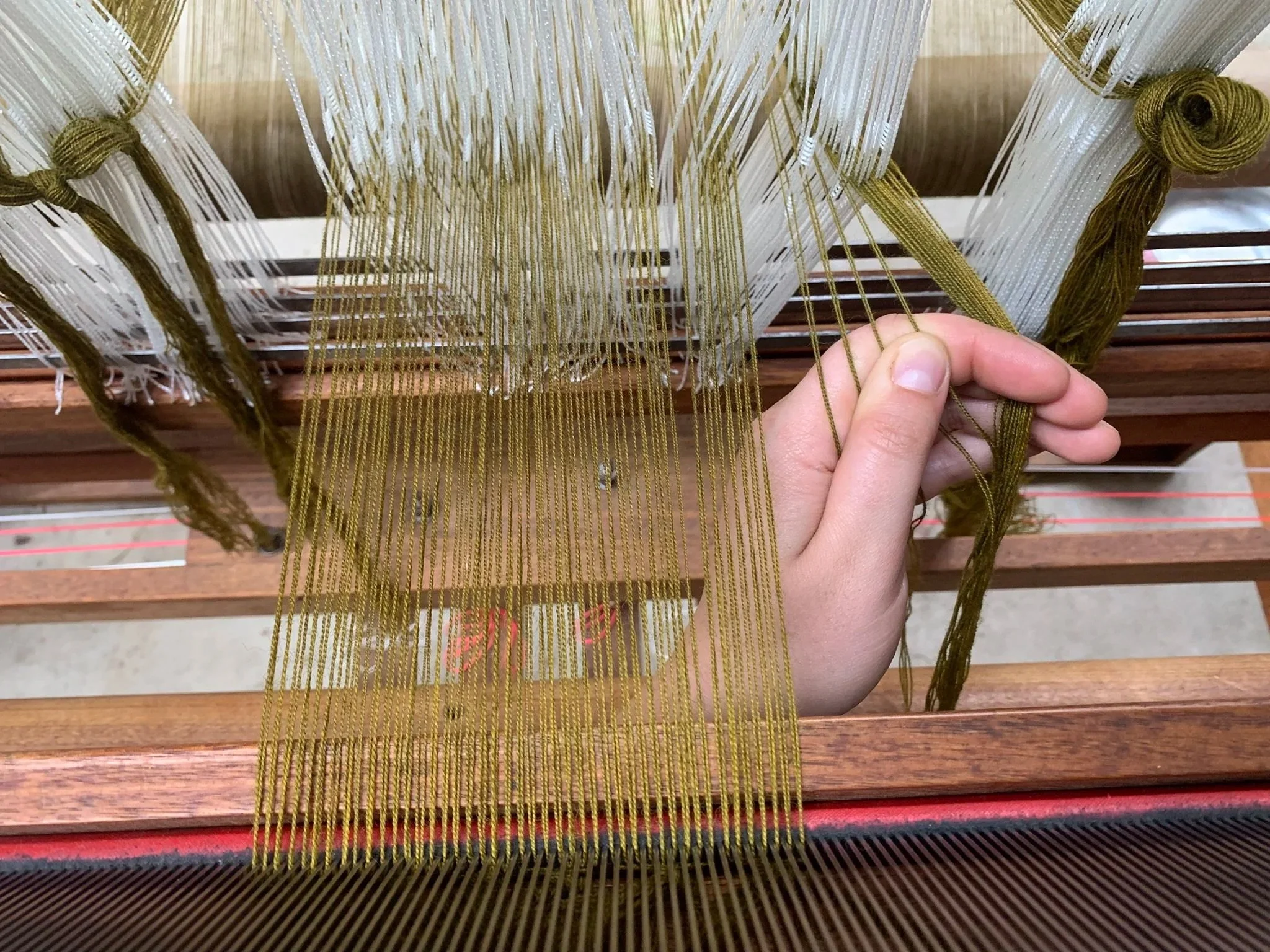 As the warp is woven, paper drops from the beam, used to ensure threads dont catch.