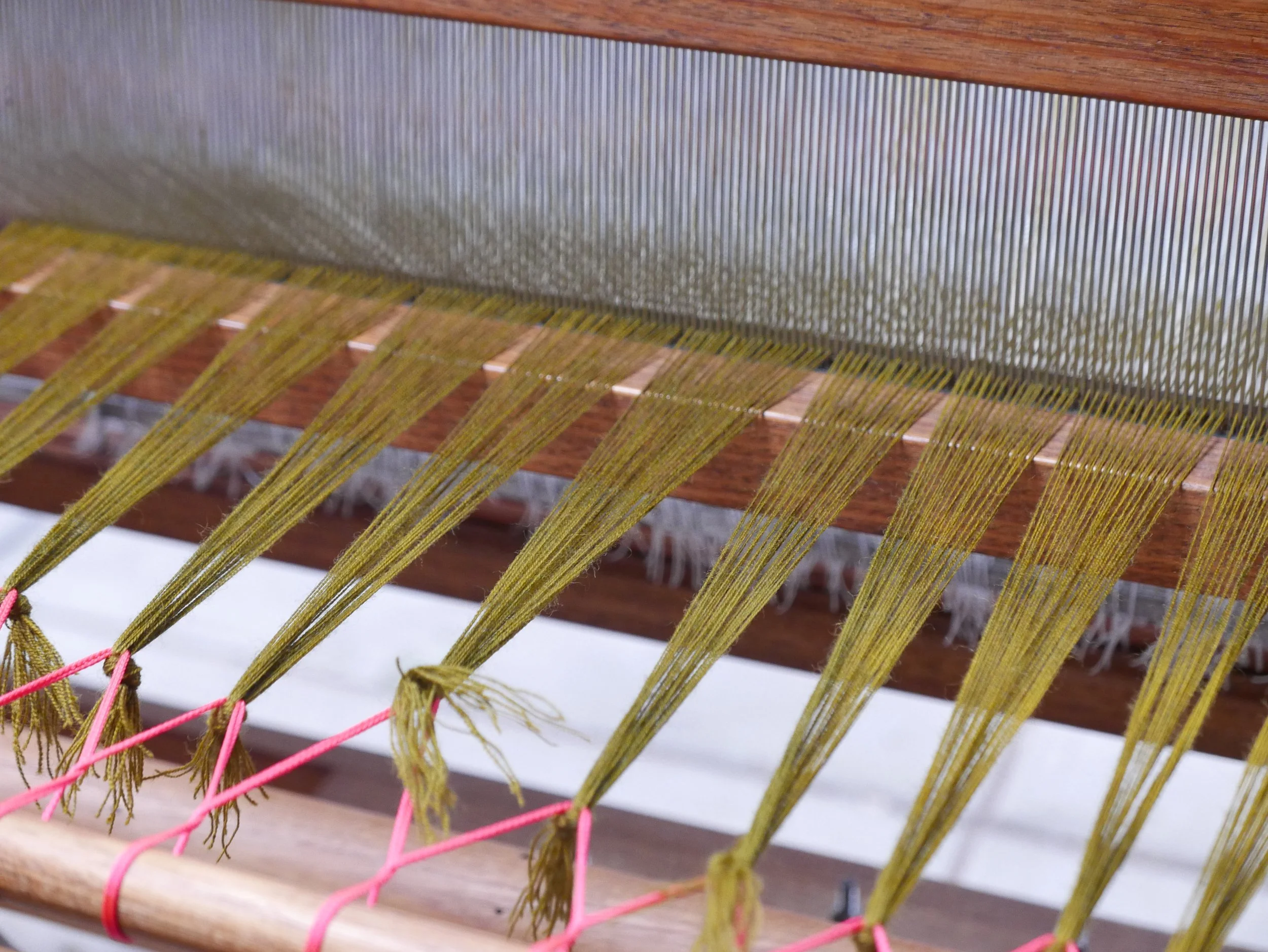 6. Each strand is then threaded in a pattern through the eye of a heddle. This warp had 400 ends (threads).